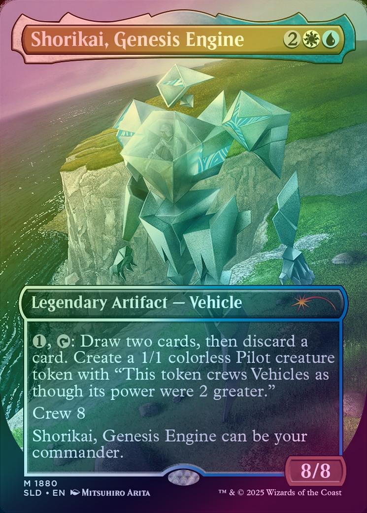 Shorikai, Genesis EngineCasting Cost: Card Type: Legendary Artifact - VehiclePower/Toughness: 8/8Card Text: , : Draw two cards, then discard a card. Create a 1/1 colorless Pilot creature token with "This token crews Vehicles as though its power were 2 greater." Crew 8 (Tap any number of creatures you control with total power 8 or more: This Vehicle becomes an artifact creature until end of turn.) Shorikai, Genesis Engine can be your commander.Artist: Mitsuhiro Arita
