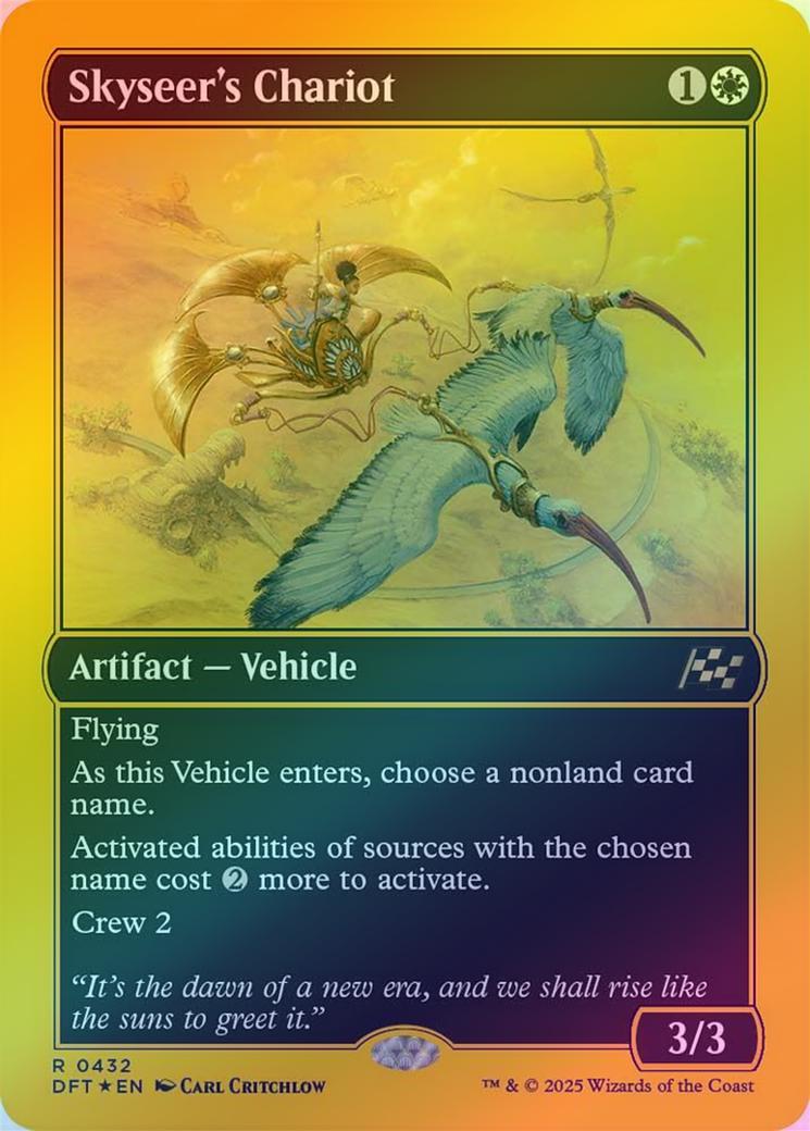 Skyseer's ChariotCasting Cost: Card Type: Artifact - VehiclePower/Toughness: 3/3Card Text: Flying As this Vehicle enters, choose a nonland card name. Activated abilities of sources with the chosen name cost more to activate. Crew 2Flavour Text: "It's the dawn of a new era, and we shall rise like the suns to greet it."Artist: Carl Critchlow