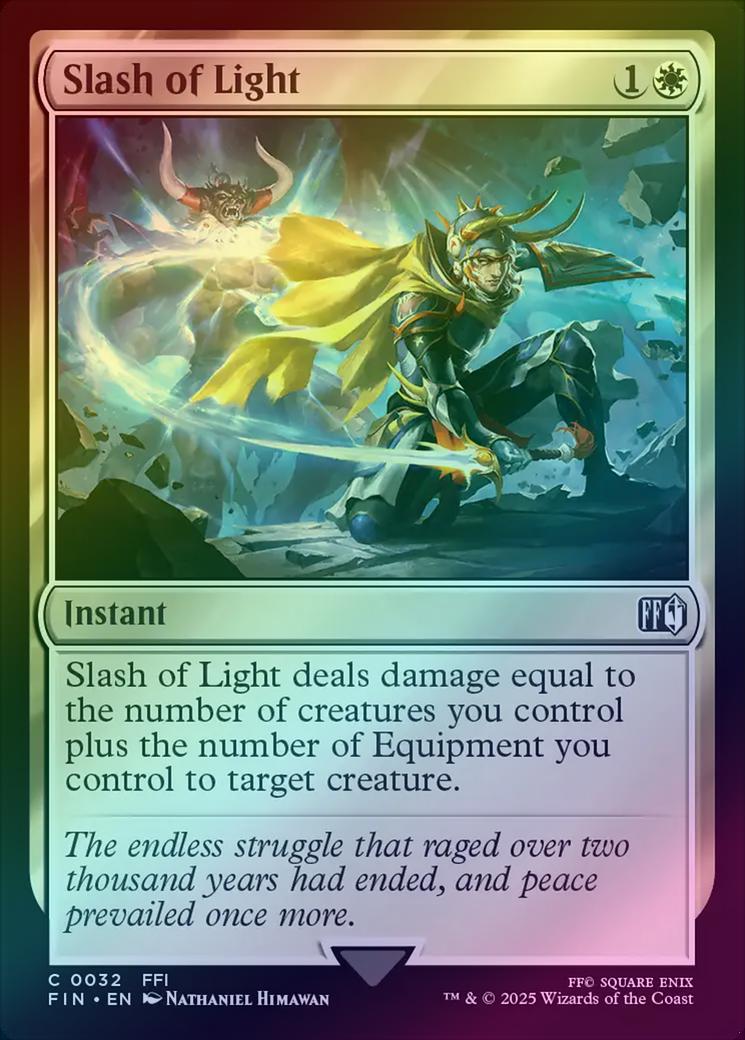 Slash of LightCasting Cost: Card Type: InstantCard Text: Slash of Light deals damage equal to the number of creatures you control plus the number of Equipment you control to target creature.Flavour Text: The endless struggle that raged over two thousand years had ended, and peace prevailed once more.Artist: Nathaniel Himawan