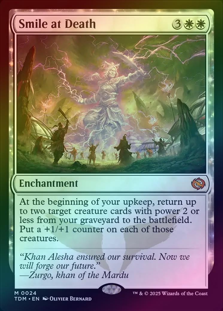 Smile at DeathCasting Cost: Card Type: EnchantmentCard Text: At the beginning of your upkeep, return up to two target creature cards with power 2 or less from your graveyard to the battlefield. Put a +1/+1 counter on each of those creatures.Flavour Text: "Khan Alesha ensured our survival. Now we will forge our future." -Zurgo, khan of the MarduArtist: Olivier Bernard