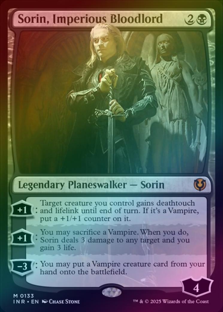 Sorin, Imperious BloodlordCasting Cost: Card Type: Legendary Planeswalker - SorinLoyalty: 4Card Text: +1: Target creature you control gains deathtouch and lifelink until end of turn. If it's a Vampire, put a +1/+1 counter on it. +1: You may sacrifice a Vampire. When you do, Sorin, Imperious Bloodlord deals 3 damage to any target and you gain 3 life. -3: You may put a Vampire creature card from your hand onto the battlefield.Artist: Chase Stone