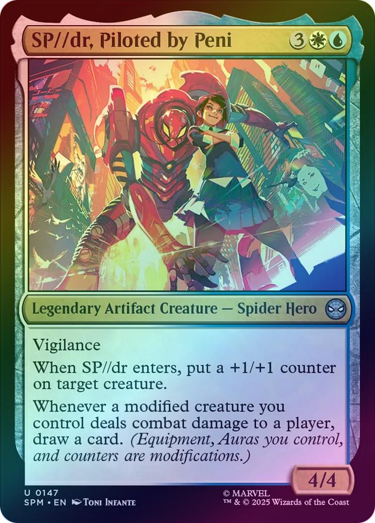 SP//dr, Piloted by PeniCasting Cost: Card Type: Legendary Artifact Creature - Spider HeroPower/Toughness: 4/4Card Text: Vigilance When SP//dr enters, put a +1/+1 counter on target creature. Whenever a modified creature you control deals combat damage to a player, draw a card. (Equipment, Auras you control, and counters are modifications.)Artist: Toni Infante