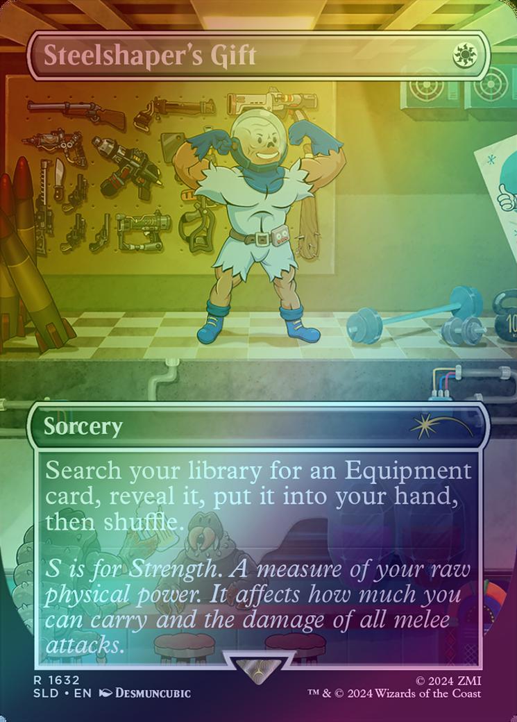 Steelshaper's GiftCasting Cost: Card Type: SorceryCard Text: Search your library for an Equipment card, reveal that card, put it into your hand, then shuffle.Flavour Text: S is for Strength. A measure of your raw physical power. It affects how much you can carry and the damage of all melee attacks.Artist: Desmuncubic