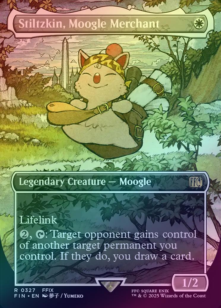 Stiltzkin, Moogle MerchantCasting Cost: Card Type: Legendary Creature - MooglePower/Toughness: 1/2Card Text: Lifelink, : Target opponent gains control of another target permanent you control. If they do, you draw a card.Artist: Yumeko