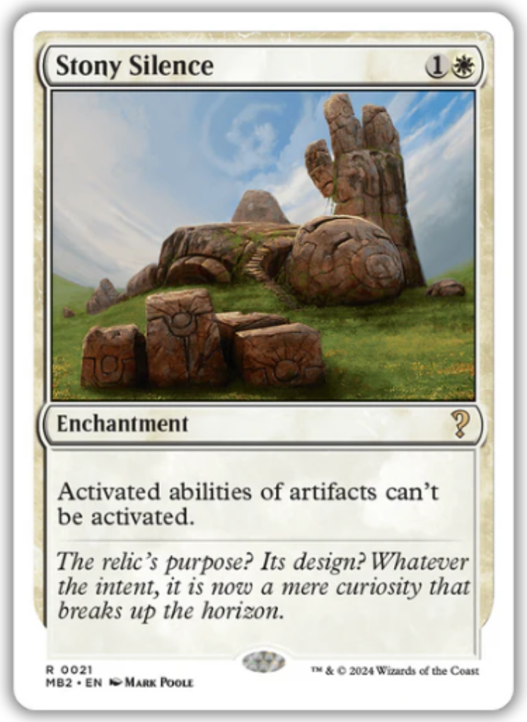 Stony SilenceCasting Cost: Card Type: EnchantmentCard Text: Activated abilities of artifacts can't be activated.Flavour Text: The relic's purpose? Its design? Whatever the intent, it is now a mere curiosity that breaks up the horizon.Artist: Mark Poole