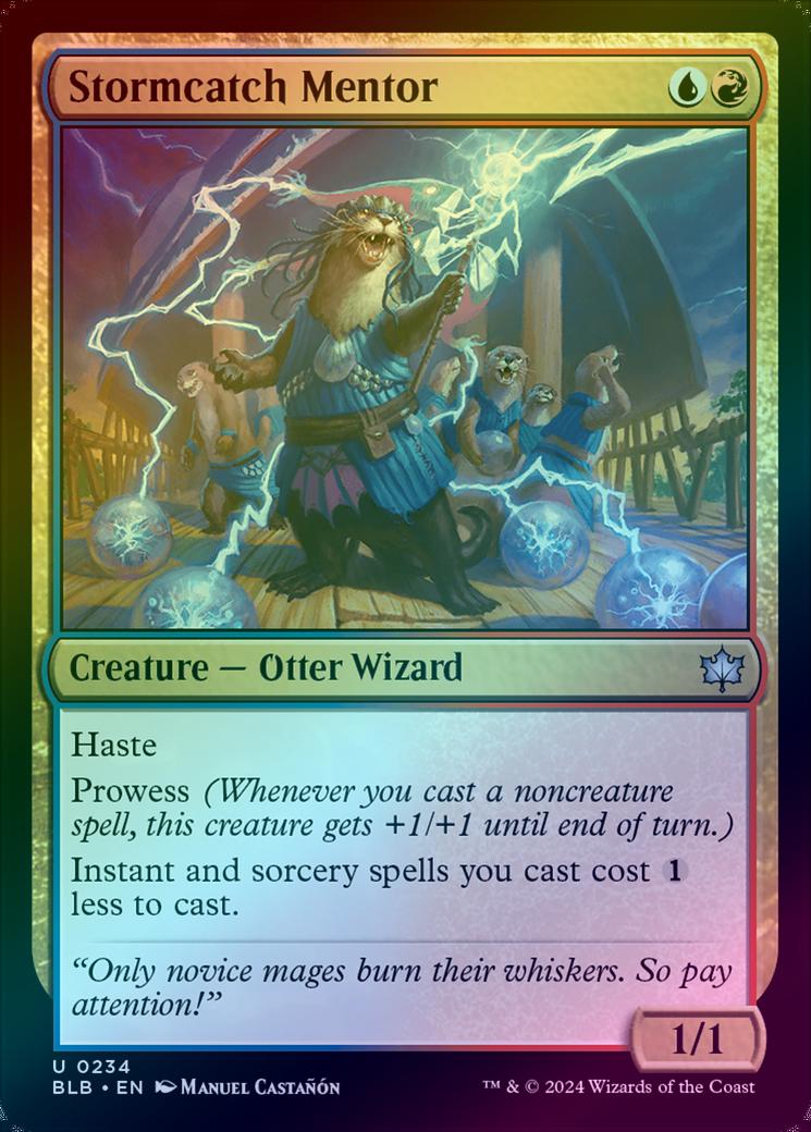 Stormcatch MentorCasting Cost: Card Type: Creature - Otter WizardPower/Toughness: 1/1Card Text: Haste Prowess (Whenever you cast a noncreature spell, this creature gets +1/+1 until end of turn.) Instant and sorcery spells you cast cost less to cast.Flavour Text: "Only novice mages burn their whiskers. So pay attention!"Artist: Manuel Castan