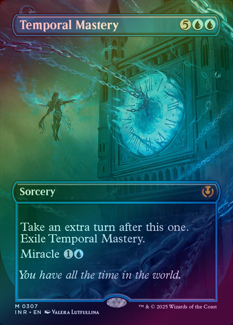 Temporal MasteryCasting Cost: Card Type: SorceryCard Text: Take an extra turn after this one. Exile Temporal Mastery. Miracle (You may cast this card for its miracle cost when you draw it if it's the first card you drew this turn.)Flavour Text: You have all the time in the world.Artist: Valera Lutfullina