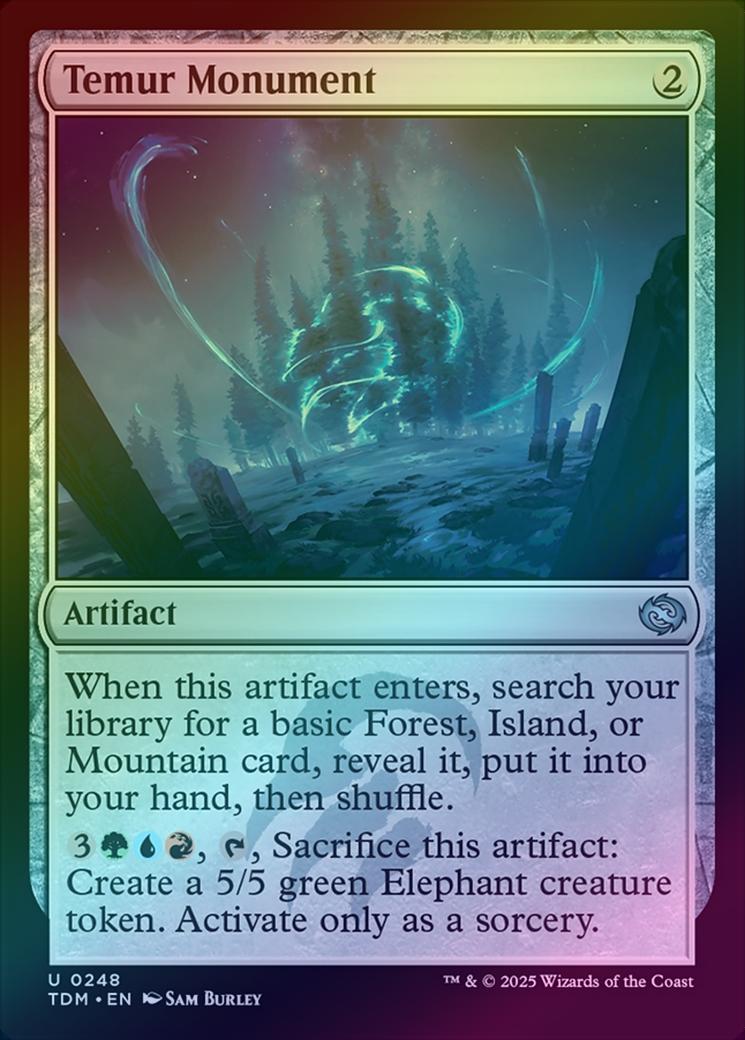 Temur MonumentCasting Cost: Card Type: ArtifactCard Text: When this artifact enters, search your library for a basic Forest, Island, or Mountain card, reveal it, put it into your hand, then shuffle. , , Sacrifice this artifact: Create a 5/5 green Elephant creature token. Activate only as a sorcery.Artist: Sam Burley