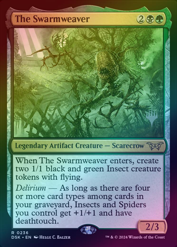 The SwarmweaverCasting Cost: Card Type: Legendary Artifact Creature - ScarecrowPower/Toughness: 2/3Card Text: When The Swarmweaver enters, create two 1/1 black and green Insect creature tokens with flying. Delirium - As long as there are four or more card types among cards in your graveyard, Insects and Spiders you control get +1/+1 and have deathtouch.Artist: Helge C. Balzer