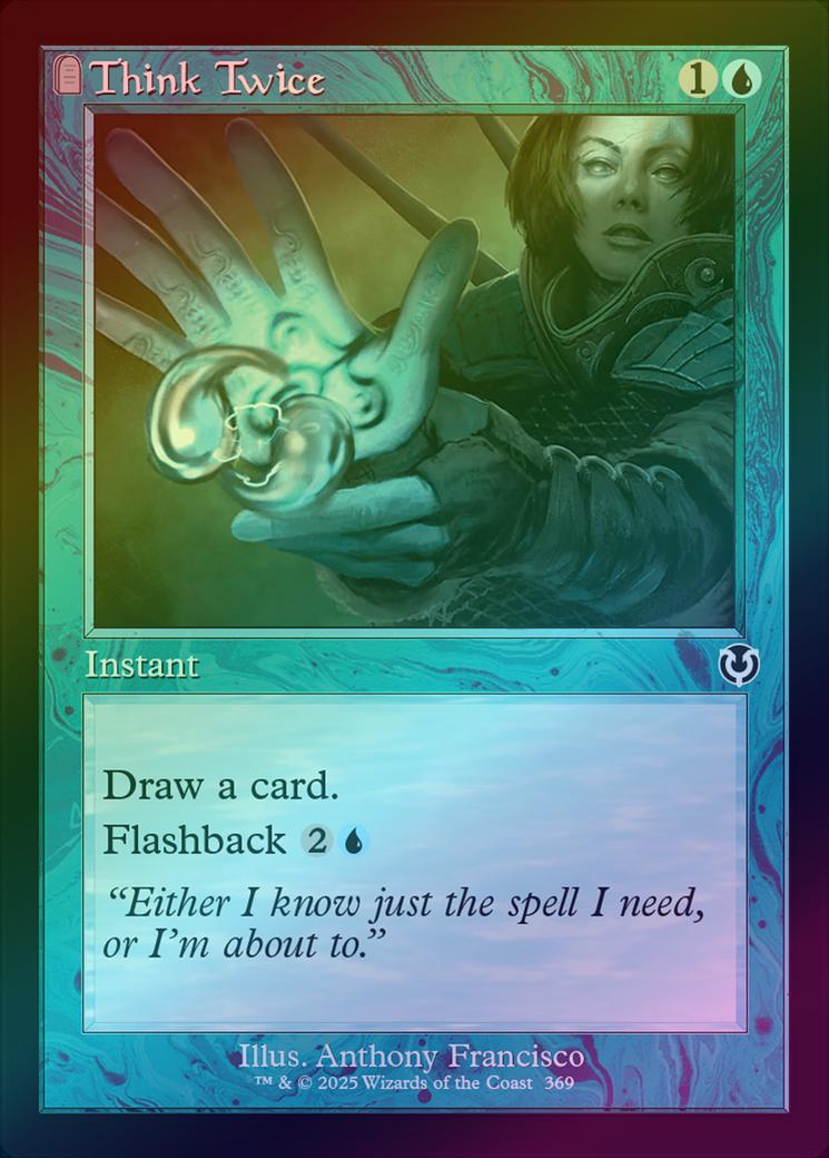 Think TwiceCasting Cost: Card Type: InstantCard Text: Draw a card. Flashback (You may cast this card from your graveyard for its flashback cost. Then exile it.)Flavour Text: "Either I know just the spell I need, or I'm about to."Artist: Anthony Francisco