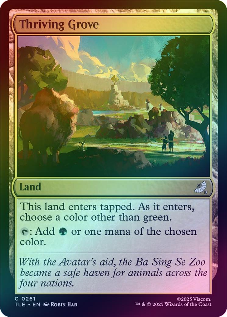 Thriving GroveCard Type: LandCard Text: This land enters tapped. As it enters, choose a color other than green. : Add or one mana of the chosen color.Flavour Text: With the Avatar's aid, the Ba Sing Se Zoo became a safe haven for animals across the four nations.Artist: Robin Har