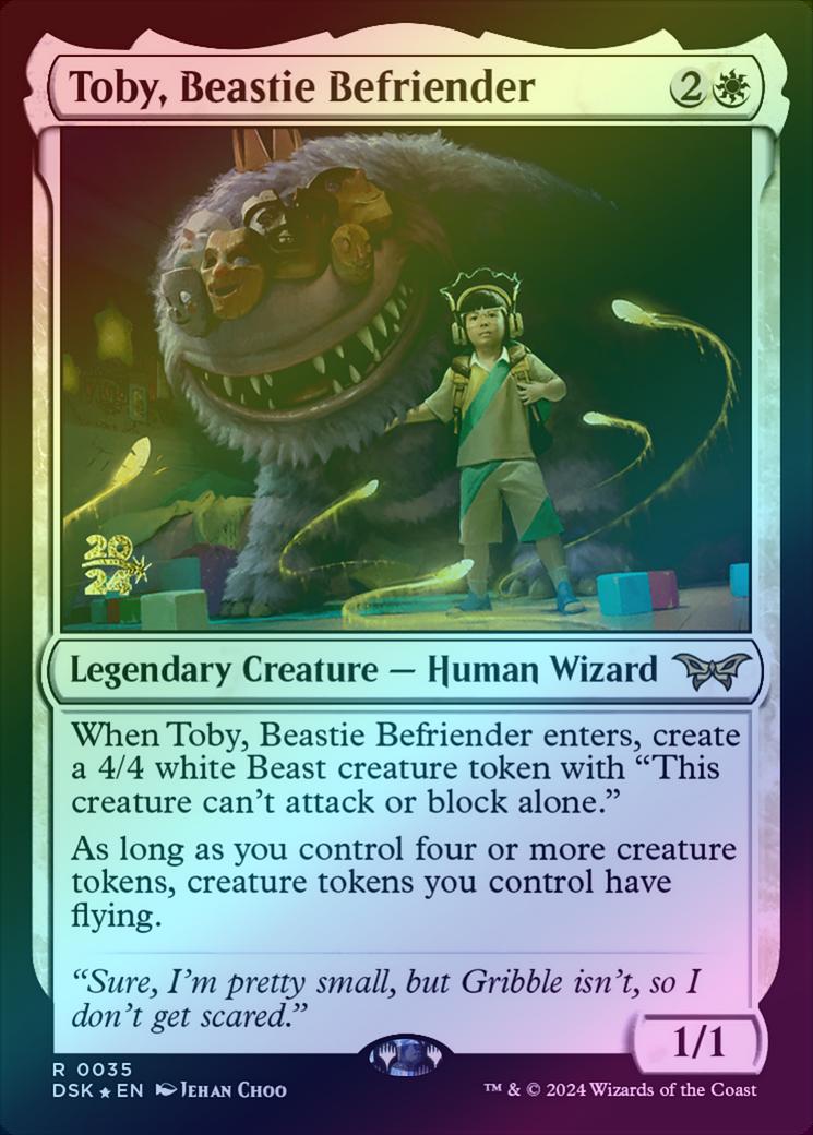 Toby, Beastie BefrienderCasting Cost: Card Type: Legendary Creature - Human WizardPower/Toughness: 1/1Card Text: When Toby, Beastie Befriender enters, create a 4/4 white Beast creature token with "This creature can't attack or block alone." As long as you control four or more creature tokens, creature tokens you control have flying.Flavour Text: "Sure, I'm pretty small, but Gribble isn't, so I don't get scared."Artist: Jehan Choo