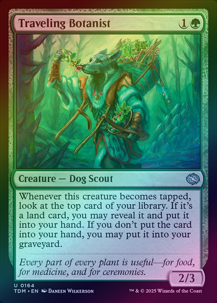 Traveling BotanistCasting Cost: Card Type: Creature - Dog ScoutPower/Toughness: 2/3Card Text: Whenever this creature becomes tapped, look at the top card of your library. If it's a land card, you may reveal it and put it into your hand. If you don't put the card into your hand, you may put it into your graveyard.Flavour Text: Every part of every plant is useful-for food, for medicine, and for ceremonies.Artist: Daneen Wilkerson