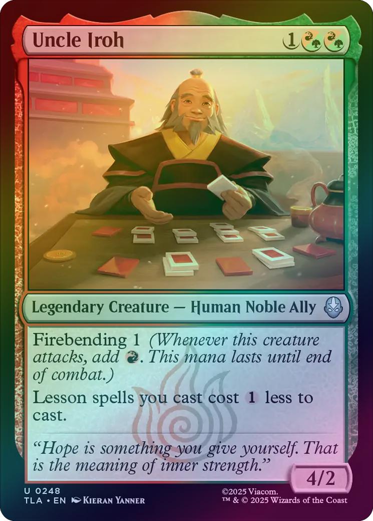 Uncle IrohCasting Cost: Card Type: Legendary Creature - Human Noble AllyPower/Toughness: 4/2Card Text: Firebending 1 (Whenever this creature attacks, add . This mana lasts until end of combat.) Lesson spells you cast cost less to cast.Flavour Text: "Hope is something you give give yourself. That is the meaning of inner strength."Artist: Kieran Yanner