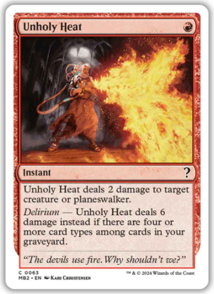 Unholy HeatCasting Cost: Card Type: InstantCard Text: Unholy Heat deals 2 damage to target creature or planeswalker. Delirium - Unholy Heat deals 6 damage instead if there are four or more card types among cards in your graveyard.Flavour Text: "The devils use fire. Why shouldn't we?"Artist: Kari Christensen