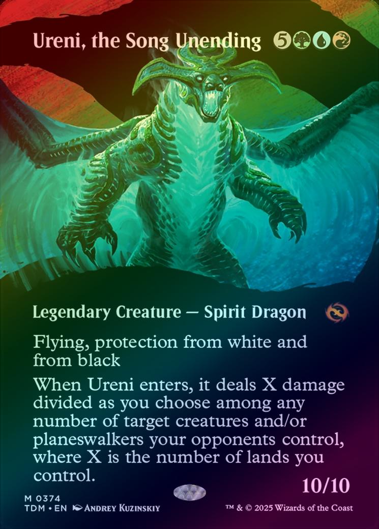 Ureni, the Song UnendingCasting Cost: Card Type: Legendary Creature - Spirit DragonPower/Toughness: 10/10Card Text: Flying, protection from white and from black When Ureni enters, it deals X damage divided as you choose among any number of target creatures and/or planeswalkers your opponents control, where X is the number of lands you control.Artist: Andrey Kuzinskiy