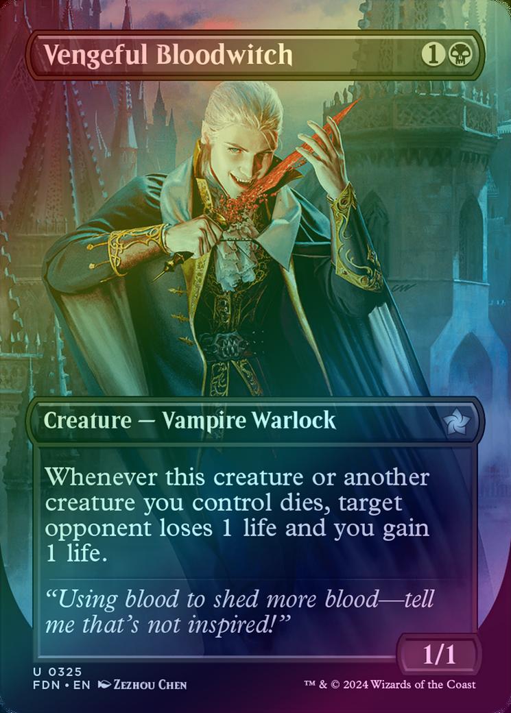 Vengeful BloodwitchCasting Cost: Card Type: Creature - Vampire WarlockPower/Toughness: 1/1Card Text: Whenever this creature or another creature you control dies, target opponent loses 1 life and you gain 1 life.Flavour Text: "Using blood to shed more blood- tell me that's not inspired!"Artist: Zezhou Chen