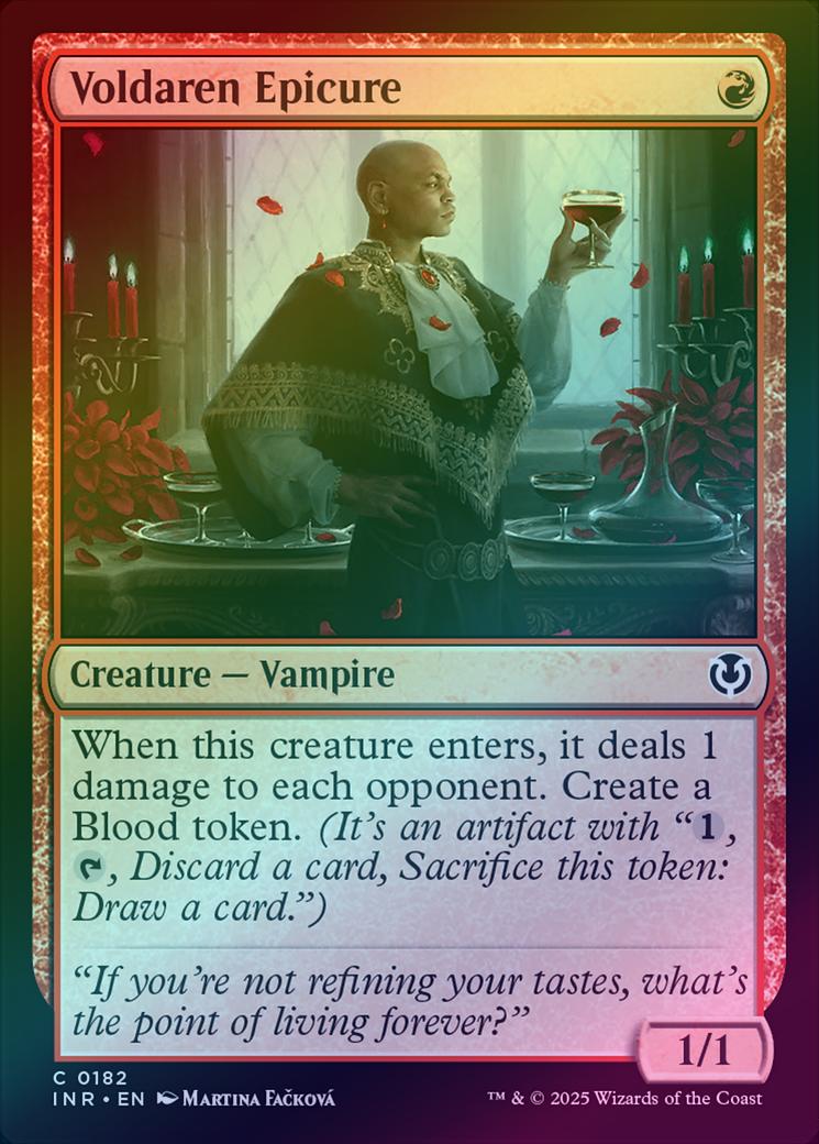 Voldaren EpicureCasting Cost: Card Type: Creature - VampirePower/Toughness: 1/1Card Text: When Voldaren Epicure enters, it deals 1 damage to each opponent. Create a Blood token. (It's an artifact with ", , Discard a card, Sacrifice this artifact: Draw a card.")Flavour Text: "If you're not refining your tastes, what's the point of living forever?"Artist: Martina Fakov