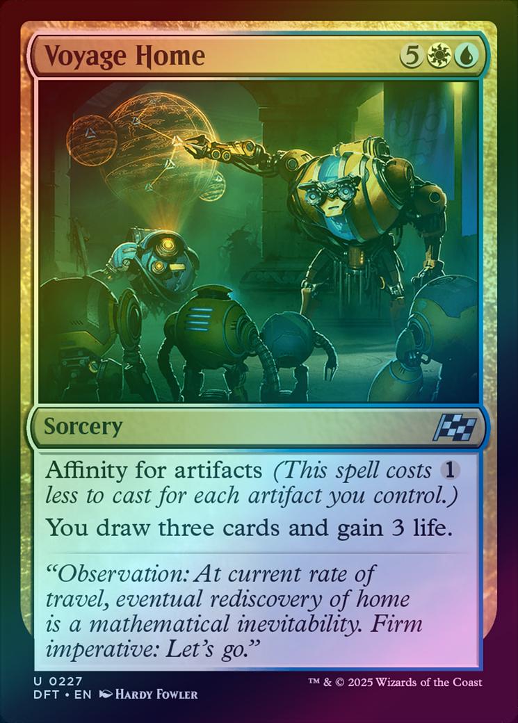 Voyage HomeCasting Cost: Card Type: SorceryCard Text: Affinity for artifacts (This spell costs less to cast for each artifact you control.) You draw three cards and gain 3 life.Flavour Text: "Observation: At current rate of travel, eventual rediscovery of home is a mathematical inevitability. Firm imperative: Let's go."Artist: Hardy Fowler