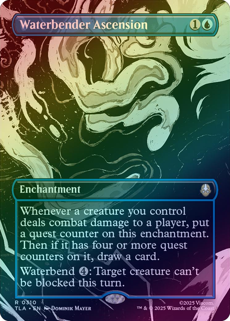Waterbender AscensionCasting Cost: Card Type: EnchantmentCard Text: Whenever a creature you control deals combat damage to a player, put a quest counter on this enchantment. Then if it has four or more quest counters on it, draw a card. Waterbend : Target creature can't be blocked this turn. (While paying a waterbend cost, you can tap your artifacts and creatures to help. Each one pays for .)Artist: Dominik Mayer