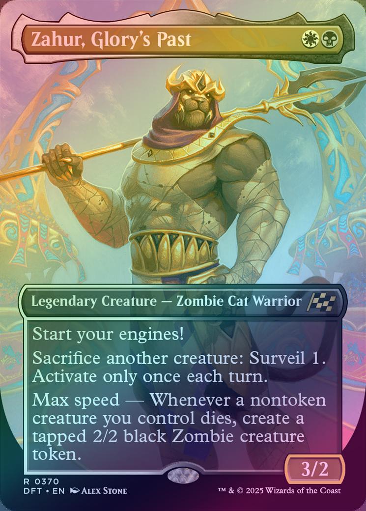 Zahur, Glory's PastCasting Cost: Card Type: Legendary Creature - Zombie Cat WarriorPower/Toughness: 3/2Card Text: Start your engines! (If you have no speed, it starts at 1. It increases once on each of your turns when an opponent loses life. Max speed is 4.) Sacrifice another creature: Surveil 1. Activate only once each turn. Max speed - Whenever a nontoken creature you control dies, create a tapped 2/2 black Zombie creature token.Artist: Alex Stone