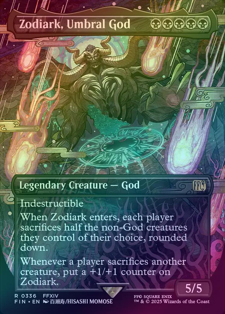 Zodiark, Umbral GodCasting Cost: Card Type: Legendary Creature - GodPower/Toughness: 5/5Card Text: Indestructible When Zodiark enters, each player sacrifices half the non-God creatures they control of their choice, rounded down. Whenever a player sacrifices another creature, put a +1/+1 counter on Zodiark.Artist: Hisashi Momose