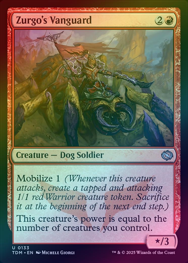 Zurgo's VanguardCasting Cost: Card Type: Creature - Dog SoldierPower/Toughness: */3Card Text: Mobilize 1 (Whenever this creature attacks, create a tapped and attacking 1/1 red Warrior creature token. Sacrifice it at the beginning of the next end step.) This creature's power is equal to the number of creatures you control.Artist: Michele Giorgi