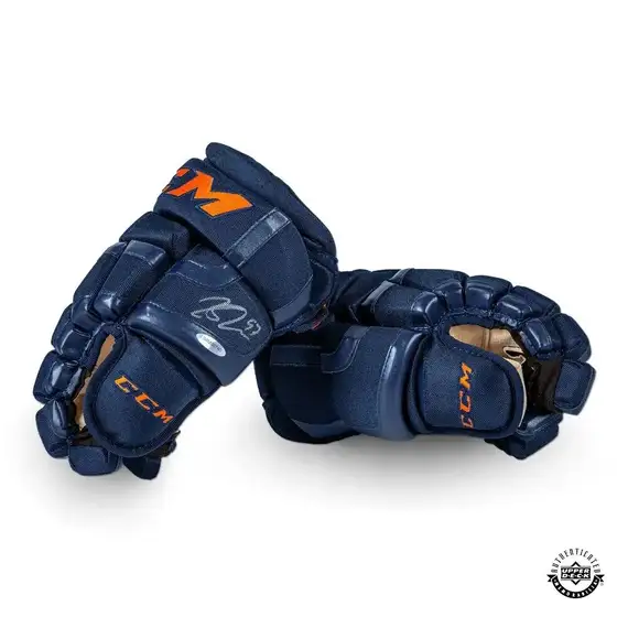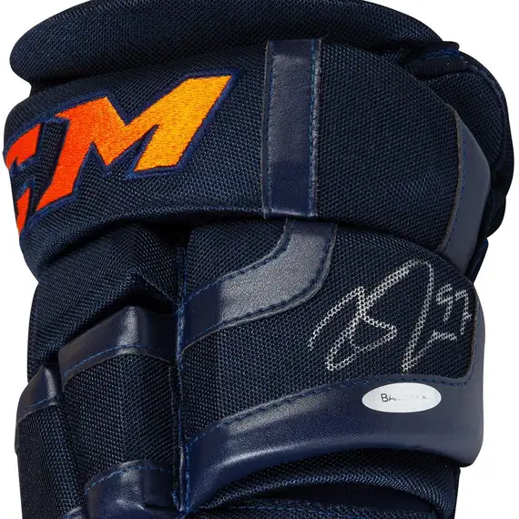 Connor McDavid was the NHL's only 100-point scorer during the 2016-17 season. For the 2017-18 season, the NHL introduced a jersey change with all teams switching from Reebok to Adidas. With the jersey change came the announcement that the Oilers would change the team's home jersey base color from blue to orange. For the new jerseys, the color of the orange was brightened and the blue was changed to a darker navy shade of blue. McDavid signed a multi-year endorsement deal with CCM at the age of 18. These pro-stock game model authentic CCM gloves incorporate the new colors to match the jerseys and have been personally hand-signed by Connor McDavid. McDavid inked his signature in silver paint pen on the right glove. His signature was witnessed by a UDA representative under UDA's Five Step Authentication Process.
