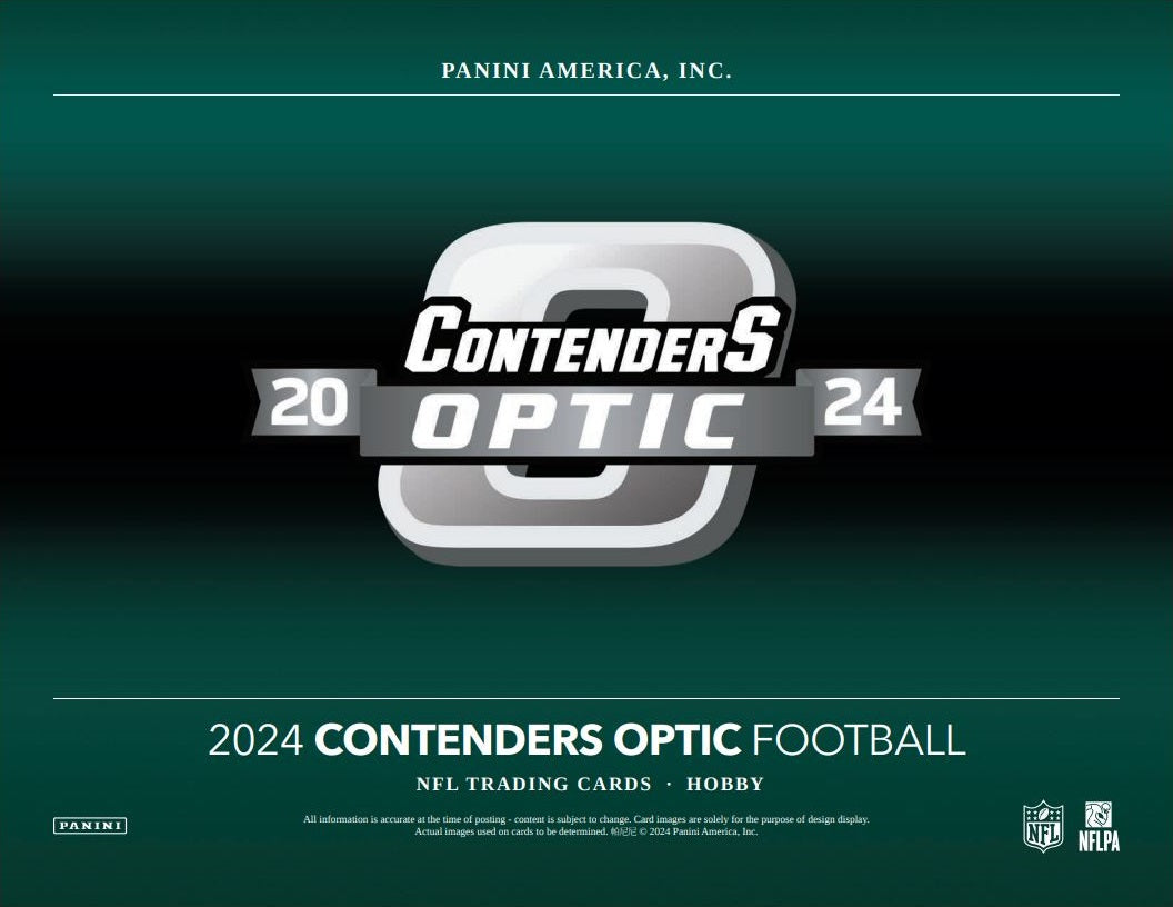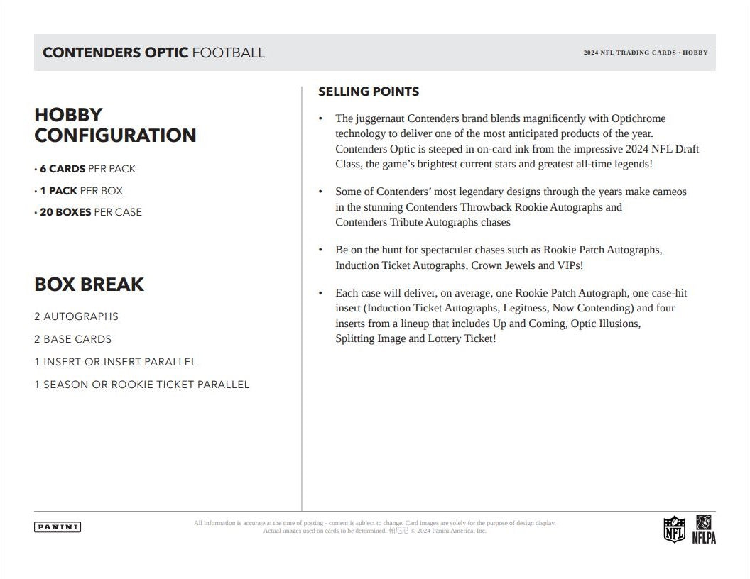 Each 2024 Panini Contenders Optic Football Hobby Box contains 2 Autographs, 1 Insert or Insert Parallel, 1 Season Ticket or Rookie Ticket Parallel & 2 Base Cards!