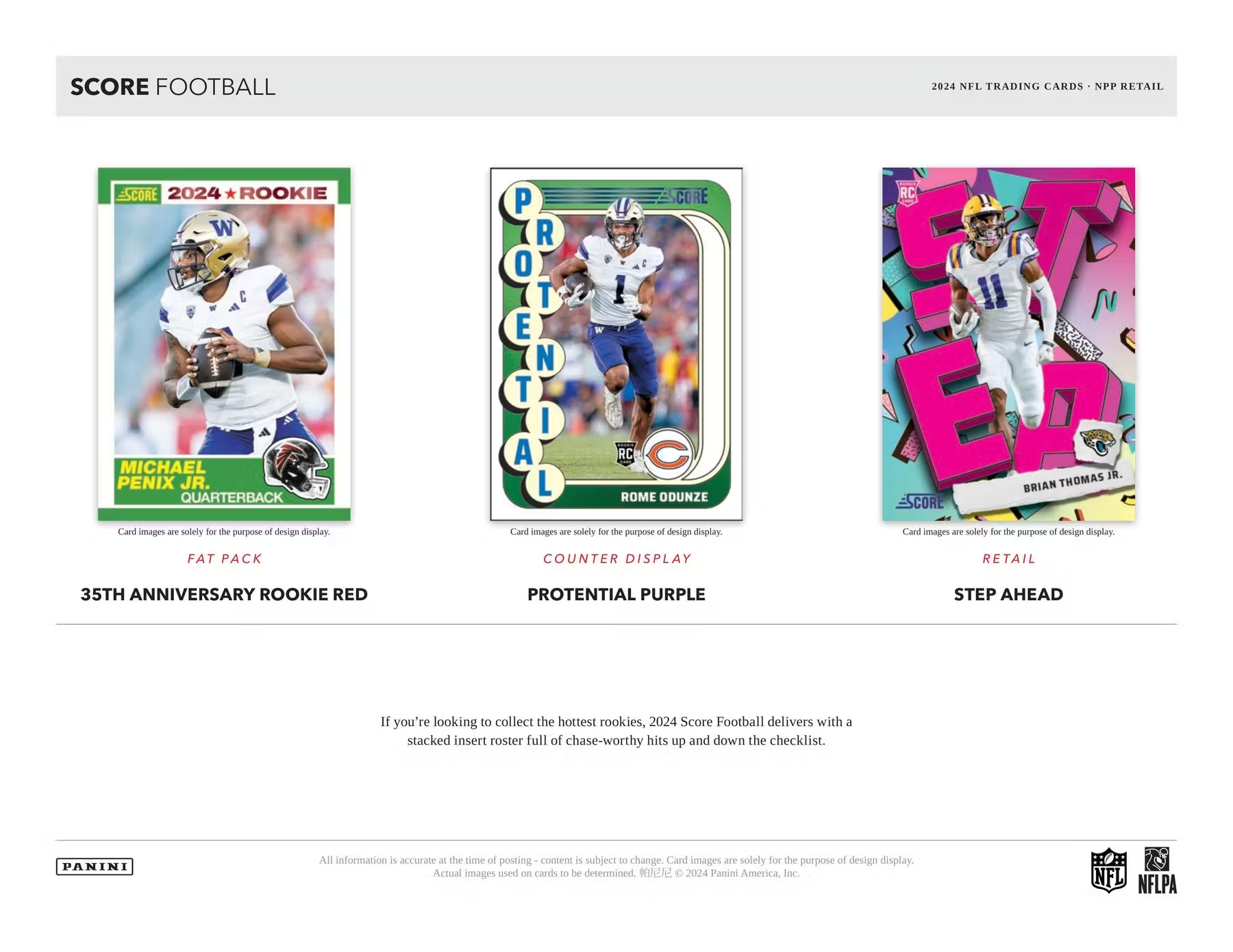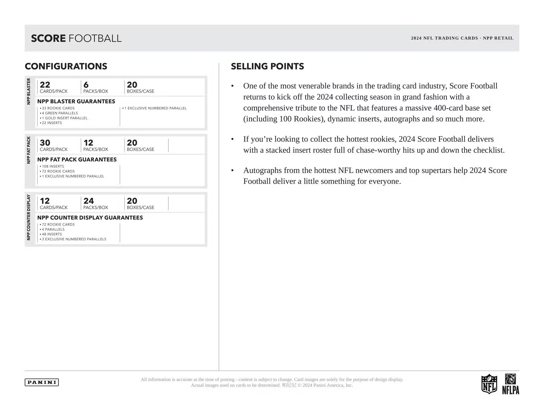 BASE: One of the most venerable brands in the trading card industry, Score Football returns to kick off the 2024 collecting season in grand fashion with a comprehensive tribute to the NFL that features a massive 400-card base set (including 100 Rookies), dynamic inserts, autographs and so much more.