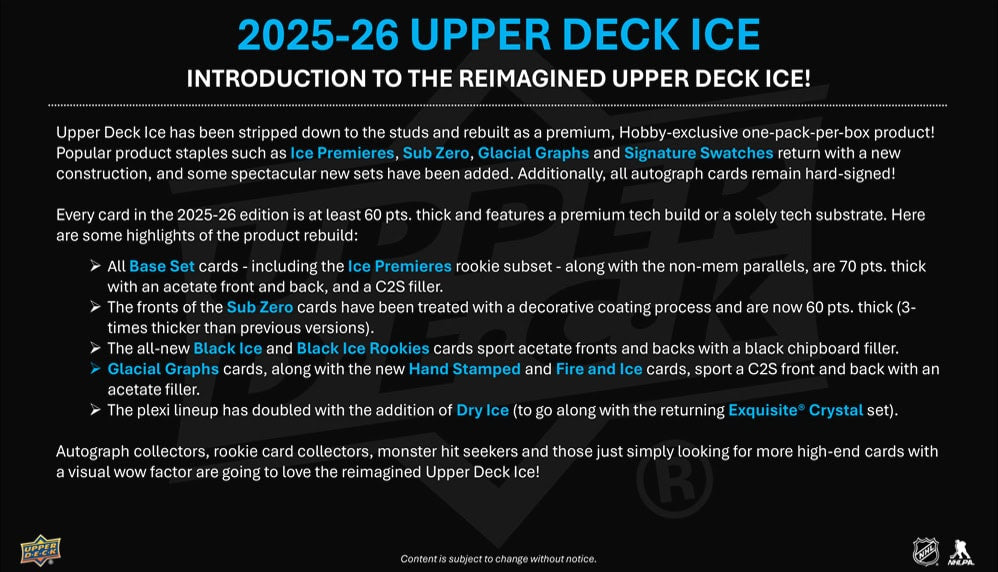 Upper Deck Ice has been stripped down to the studs and rebuilt as a premium, Hobby-exclusive one-pack-per-box product! Popular product staples such as Ice Premieres, Sub Zero, Glacial Graphs, and Signature Swatches return with a new construction, and some spectacular new sets have been added. Additionally, all autograph cards remain hard-signed!