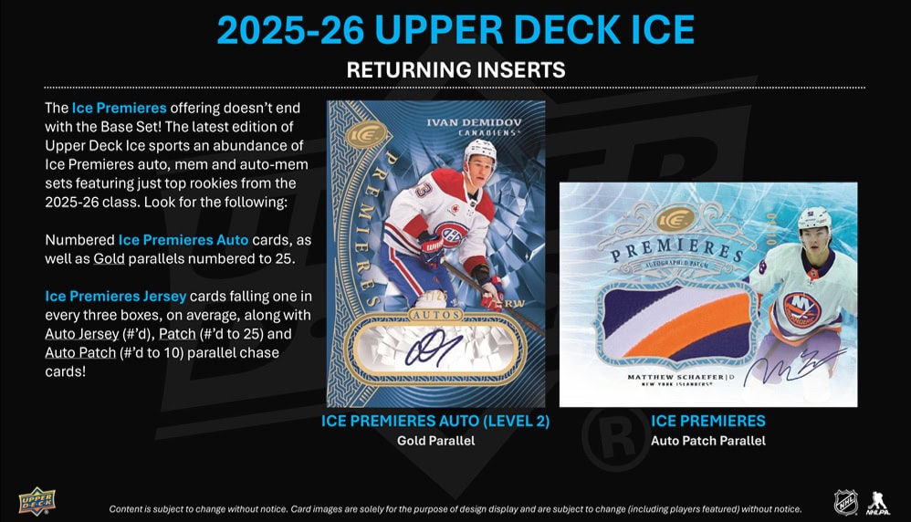 The Ice Premieres offering doesn’t end with the Base Set! The latest edition of Upper Deck Ice sports an abundance of Ice Premieres auto, mem and auto-mem sets featuring just top rookies from the 2025-26 class. Look for the following: