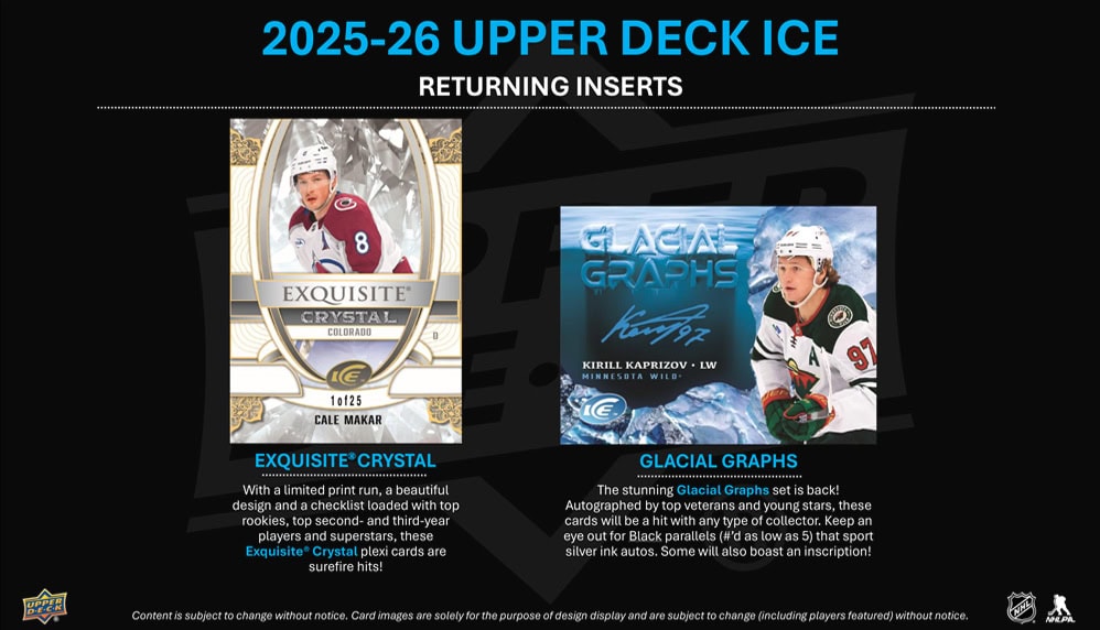 For the first time in 20 years, UD Ice will feature Cool Threads cards! Each card is numbered to 249 and features a game-worn jersey swatch. Be on the lookout for some amazing parallels (all numbered): Auto Jersey, Patch and Auto Patch!