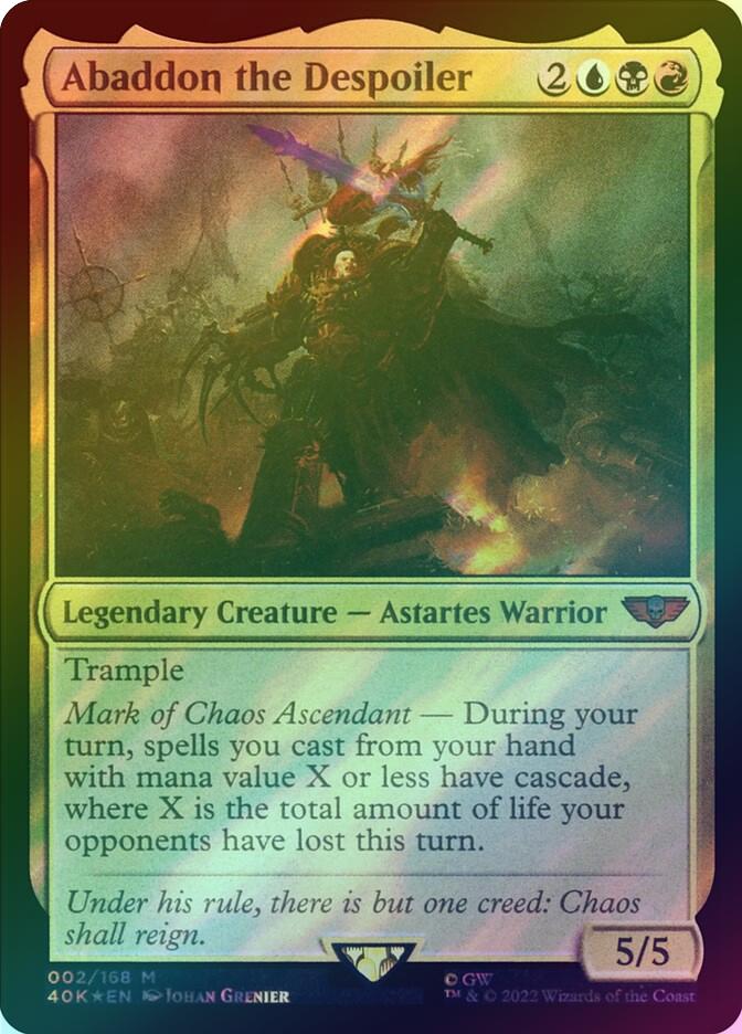 Abaddon the DespoilerCasting Cost: Card Type: Legendary Creature - Astartes WarriorPower/Toughness: 5/5Card Text: Trample Mark of the Chaos Ascendant - During your turn, spells you cast from your hand with mana value X or less have cascade, where X is the total amount of life your opponents have lost this turn.Flavour Text: Under his rule, there is but one creed: Chaos shall reign.Artist: Johan Grenier