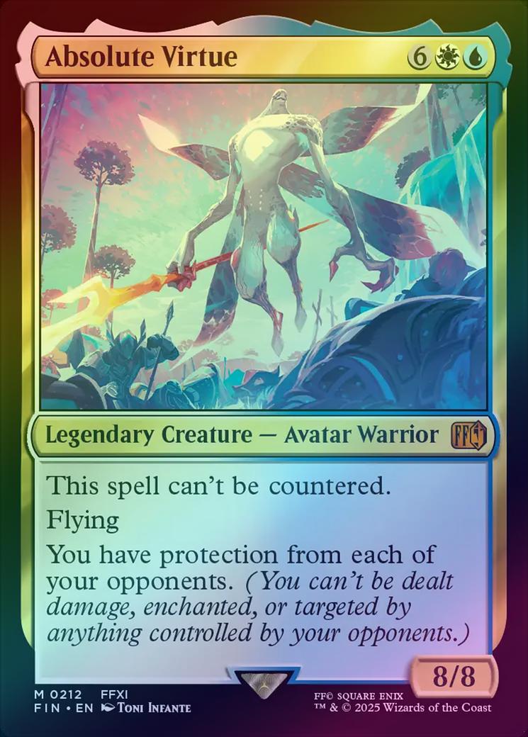 Absolute VirtueCasting Cost: Card Type: Legendary Creature - Avatar WarriorPower/Toughness: 8/8Card Text: This spell can't be countered. Flying You have protection from each of your opponents. (You can't be dealt damage, enchanted, or targeted by anything controlled by your opponents.)Artist: Toni Infante