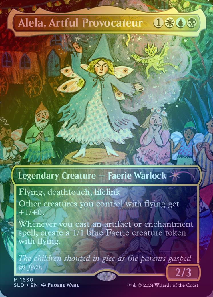 Alela, Artful ProvocateurCasting Cost: Card Type: Legendary Creature - Faerie WarlockPower/Toughness: 2/3Card Text: Flying, deathtouch, lifelink Other creatures you control with flying get +1/+0. Whenever you cast an artifact or enchantment spell, create a 1/1 blue Faerie creature token with flying.Flavour Text: The children shouted in glee as the parents gasped in fear.Artist: Phoebe Wahl