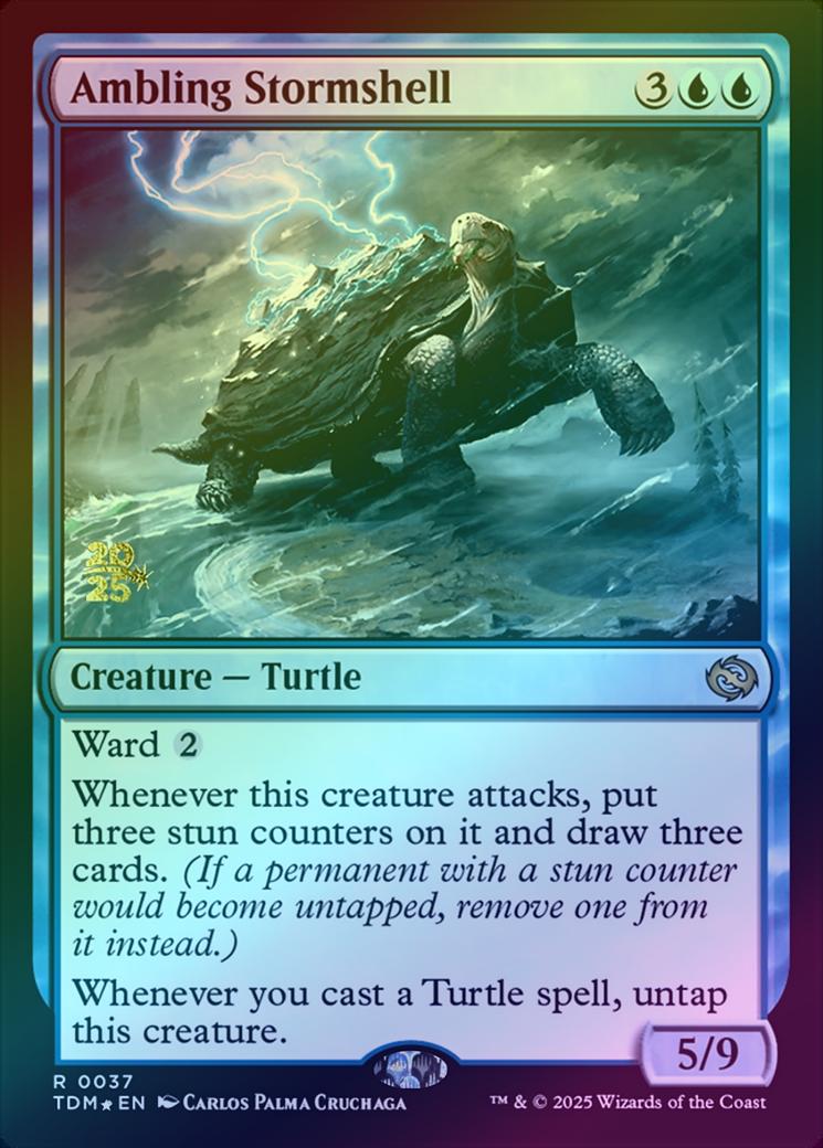 Ambling StormshellCasting Cost: Card Type: Creature - TurtlePower/Toughness: 5/9Card Text: Ward Whenever this creature attacks, put three stun counters on it and draw three cards. (If a permanent with a stun counter would become untapped, remove one from it instead.) Whenever you cast a Turtle spell, untap this creature.Artist: Carlos Palma Cruchaga
