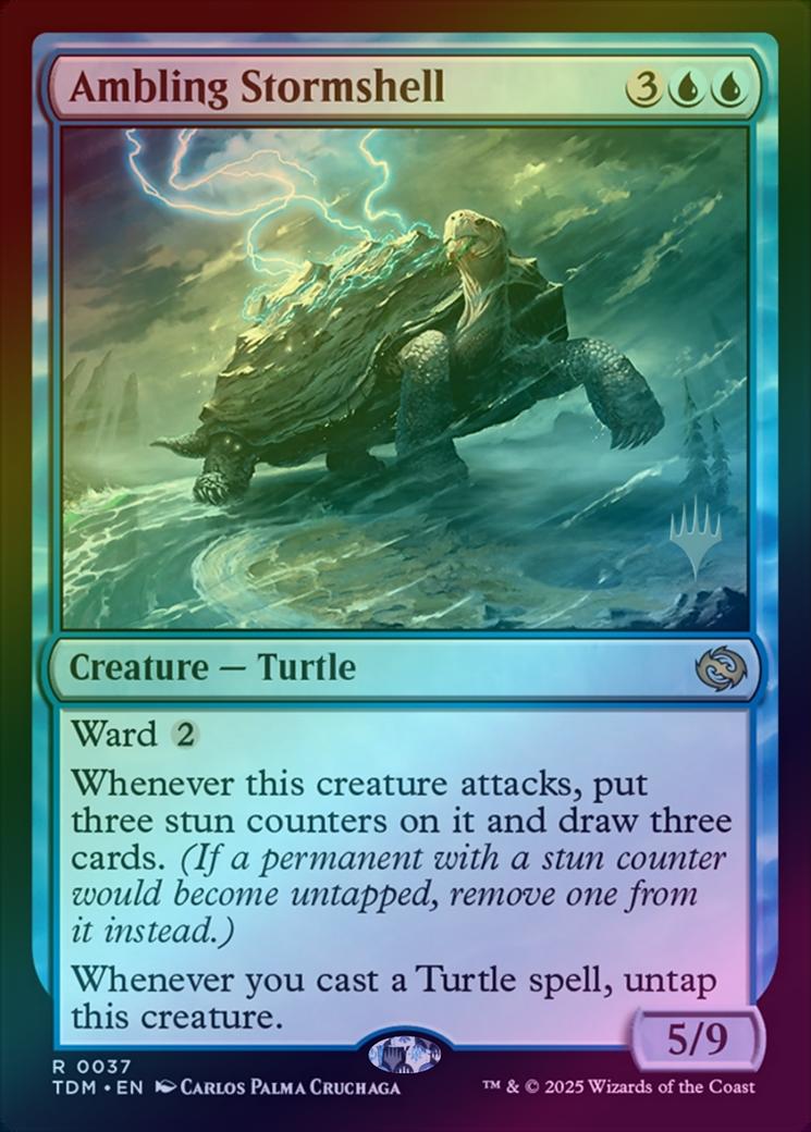 Ambling StormshellCasting Cost: Card Type: Creature - TurtlePower/Toughness: 5/9Card Text: Ward Whenever this creature attacks, put three stun counters on it and draw three cards. (If a permanent with a stun counter would become untapped, remove one from it instead.) Whenever you cast a Turtle spell, untap this creature.Artist: Carlos Palma Cruchaga