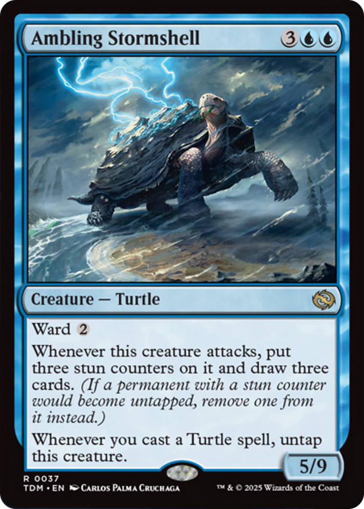 Ambling StormshellCasting Cost: Card Type: Creature - TurtlePower/Toughness: 5/9Card Text: Ward Whenever this creature attacks, put three stun counters on it and draw three cards. (If a permanent with a stun counter would become untapped, remove one from it instead.) Whenever you cast a Turtle spell, untap this creature.Artist: Carlos Palma Cruchaga