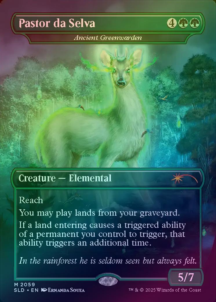 Ancient GreenwardenCasting Cost: Card Type: Creature - ElementalPower/Toughness: 5/7Card Text: Reach (This creature can block creatures with flying.) You may play lands from your graveyard. If a land entering causes a triggered ability of a permanent you control to trigger, that ability triggers an additional time.Flavour Text: In the rainforest he is seldom seen but always felt.Artist: Ernanda Souza