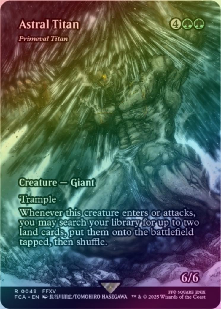 Primeval TitanCasting Cost: Card Type: Creature - GiantPower/Toughness: 6/6Card Text: Trample Whenever this creature enters or attacks, you may search your library for up to two land cards, put them onto the battlefield tapped, then shuffle.Artist: Tomohiro Hasegawa