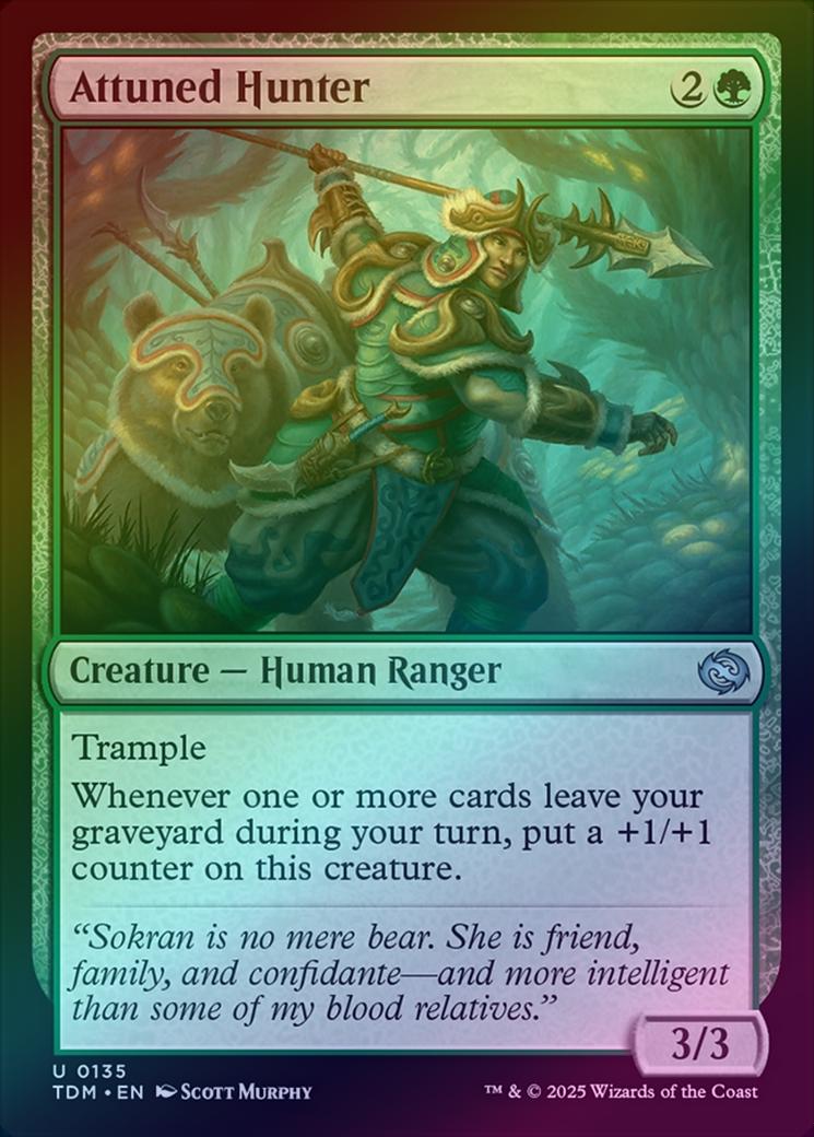 Attuned HunterCasting Cost: Card Type: Creature - Human RangerPower/Toughness: 3/3Card Text: Trample Whenever one or more cards leave your graveyard during your turn, put a +1/+1 counter on this creature.Flavour Text: "Sokran is no mere bear. She is friend, family, and confidante-and more intelligent than some of my blood relatives."Artist: Scott Murphy