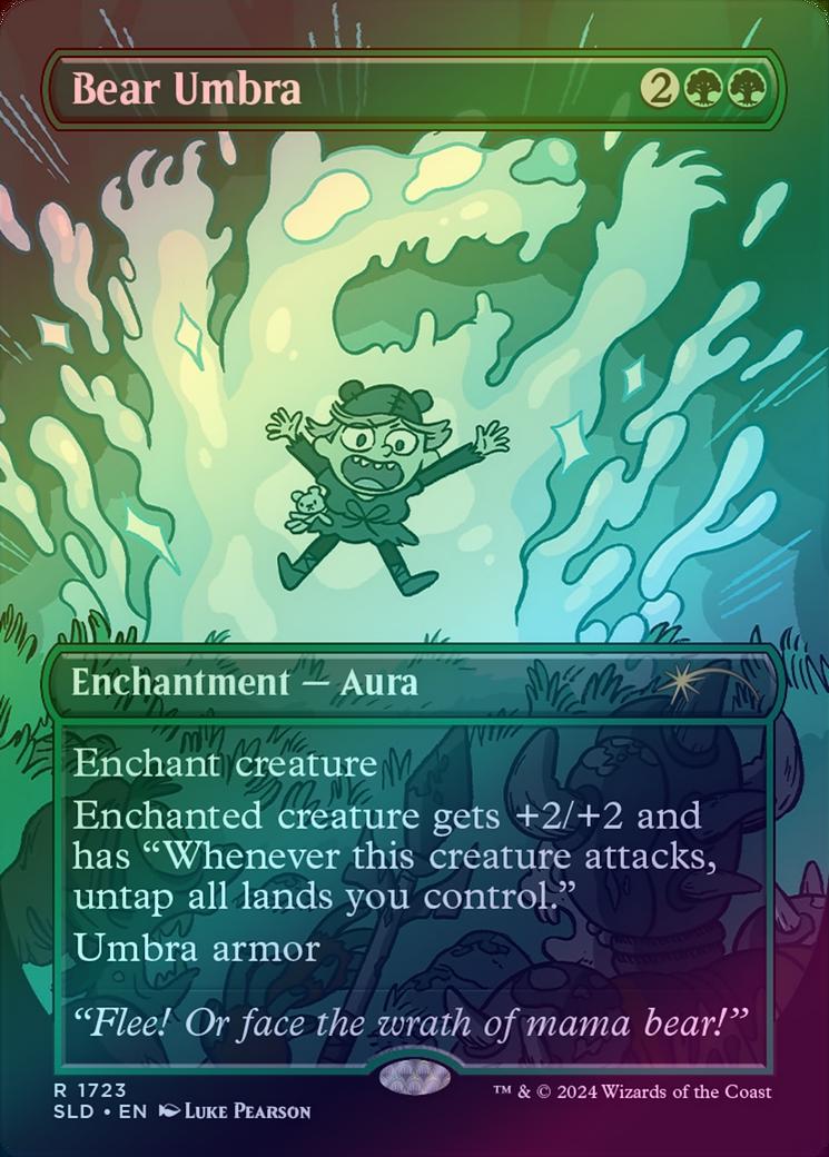 Bear UmbraCasting Cost: Card Type: Enchantment - AuraCard Text: Enchant creature Enchanted creature gets +2/+2 and has "Whenever this creature attacks, untap all lands you control." Umbra armor (If enchanted creature would be destroyed, instead remove all damage from it and destroy this Aura.)Flavour Text: "Flee! Or face the wrath of mama bear!"Artist: Luke Pearson
