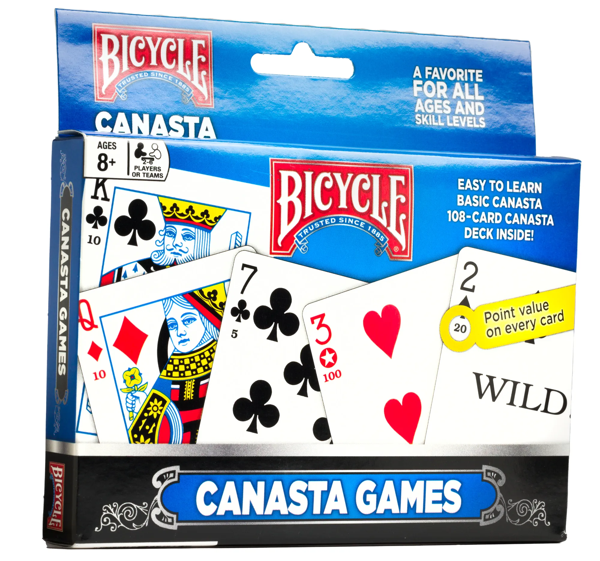 Bicycle Playing Cards Canasta Set includes unique, value-added card faces with point values on each card, plus highlights on WILD cards. Canasta games play fast and are full of exciting twists. Players attempt to make melds of 7 cards of the same rank, and “go out” by playing all cards in their hand and discarding. Set contains rules (including basic Canasta as well as seven popular variations) and a 108-card deck featuring Bicycle Fan Back design cards first introduced in 1894.