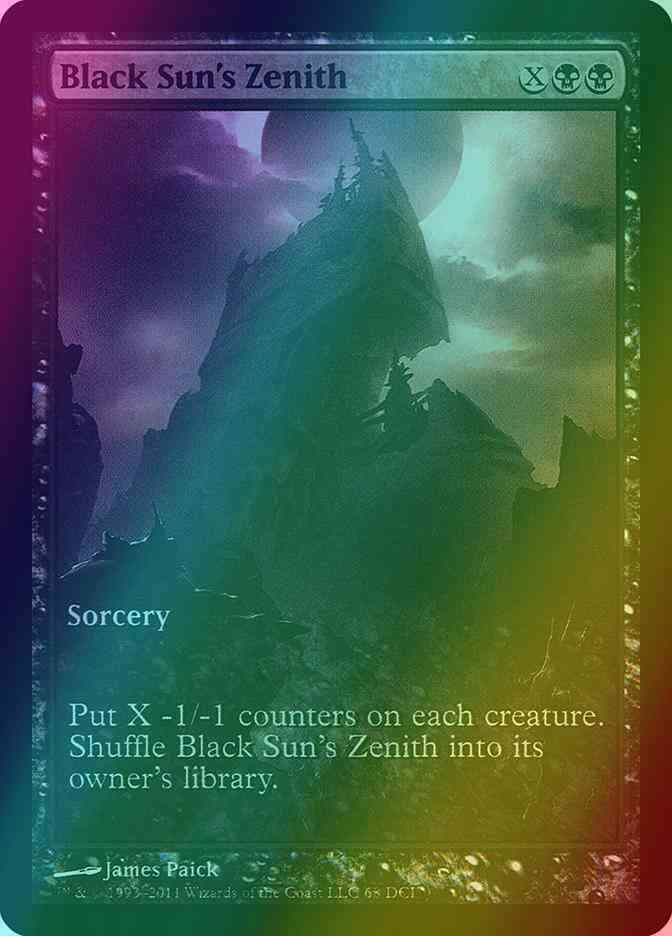 Black Sun's ZenithCasting Cost: Card Type: SorceryCard Text: Put X -1/-1 counters on each creature. Shuffle Black Sun's Zenith into its owner's library.Artist: James PaickRarity: Rare