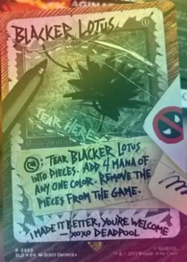 Blacker LotusCasting Cost: Card Type: ArtifactCard Text: : Tear this artifact into pieces. Add four mana of any one color. Remove the pieces from the game.Flavour Text: I MADE IT BETTER, YOU'RE WELCOME-XOXO DEADPOOLArtist: Scott Okumura