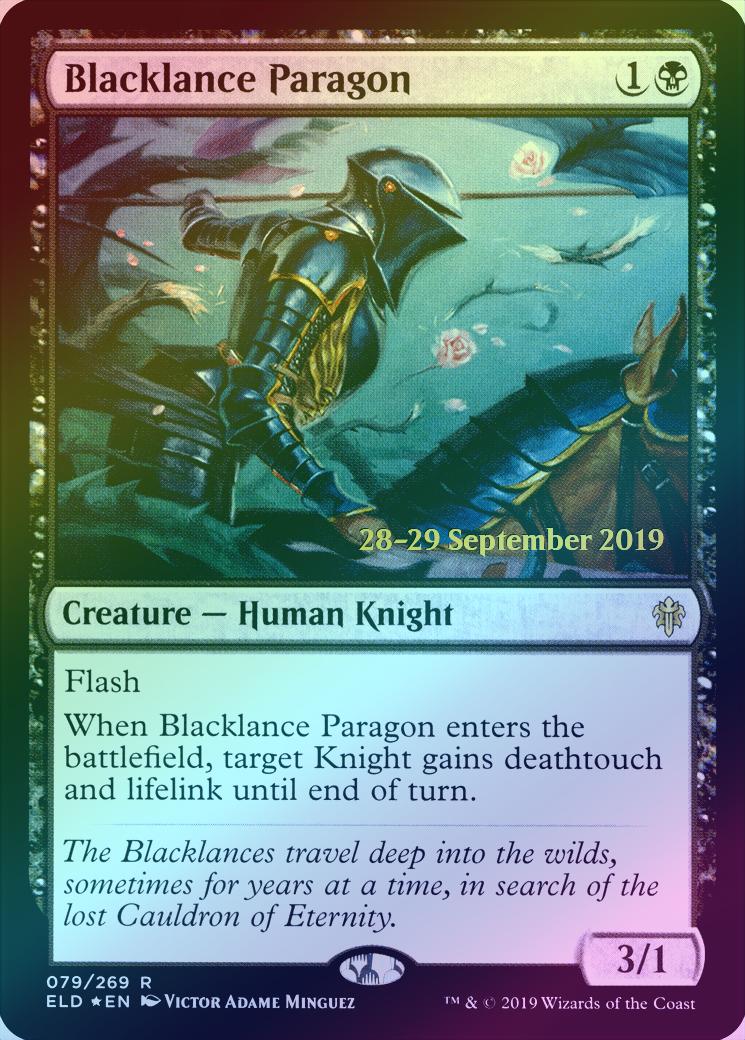 Blacklance ParagonCasting Cost: Card Type: Creature - Human KnightPower/Toughness: 3/1Card Text: Flash When Blacklance Paragon enters, target Knight gains deathtouch and lifelink until end of turn.Flavour Text: The Blacklances travel deep into the wilds, sometimes for years at a time, in search of the lost Cauldron of Eternity.Artist: Victor Adame Minguez