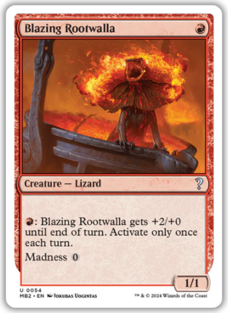 Blazing RootwallaCasting Cost: Card Type: Creature - LizardPower/Toughness: 1/1Card Text: : Blazing Rootwalla gets +2/+0 until end of turn. Activate only once each turn. Madness (If you discard this card, discard it into exile. When you do, cast it for its madness cost or put it into your graveyard.)Artist: Jokubas Uogintas