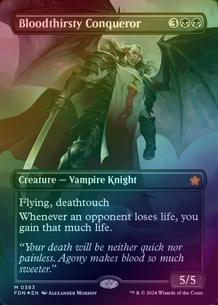 Bloodthirsty ConquerorCasting Cost: Card Type: Creature - Vampire KnightPower/Toughness: 5/5Card Text: Flying, deathtouch Whenever an opponent loses life, you gain that much life. (Damage causes loss of life.)Flavour Text: "Your death will be neither quick nor painless. Agony makes blood so much sweeter."Artist: Alexander Mokhov