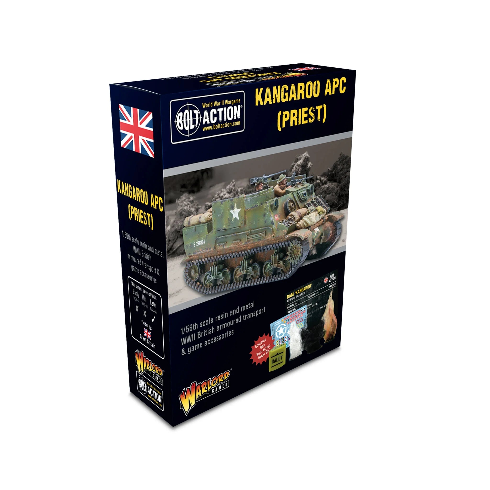 Contains one Kangaroo APC, cast in resin & metal, with waterslide decal sheet, Bolt Action Order Die, Bolt Action: Third Edition vehicle stat card, and vehicle damage markers.